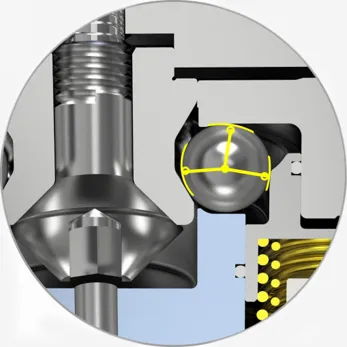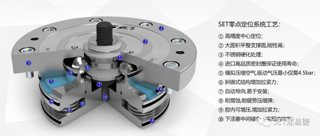Un'altra caratteristica del sistema a punti zero è la sua doppia funzione: il posizionamento e il serraggio vengono eseguiti contemporaneamente, con un'accuratezza inferiore a 5 μs. Il perno di posizionamento conico corto rende la superficie di contatto completamente chiusa e ha la funzione dell'autobloccamento. Il blocco di posizionamento consente una determinata deviazione radiale e deviazione angolare, che presenta alcuni vantaggi per il caricamento e lo scarico automatici o manuali.
