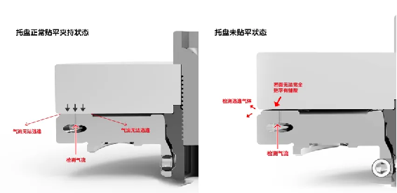 Al fine di garantire la stabilità del vassoio e soddisfare i requisiti di posizionamento, il posizionatore zero dovrebbe aggiungere un dispositivo di rilevamento del serraggio, lo scopo di questo dispositivo è garantire che il posizionatore zero possa contattare completamente la superficie di posizionamento del vassoio e non vi sarà alcun taglio di ferro o altri detriti nel mezzo. Il suo principio di lavoro è mostrato nella figura (1). L'aria di rilevamento rilascerà la pressione dell'aria (0,2 MPA) all'esterno del foro. Imposta il valore di valutazione del sensore di flusso. Quando il vassoio non è piatto con il posizionatore, come mostrato nella Figura 2, il gas in fuga rilevato sfuggirà verso l'esterno lungo lo spazio e il sensore di flusso determinerà la differenza di flusso, in modo da realizzare il rilevamento del serraggio. Il foro di rilevamento spruzzerà anche la pressione di pulizia di 0,6 MPA verso l'esterno per garantire la pulizia di stoma. Più localizzatori possono essere rilevati contemporaneamente, riducendo così i costi; 2. Una volta che vi è un valore di flusso di perdita in più posizionatori, sarà incompatibile con il valore di flusso preimpostato, quindi è più sicuro; 3. Il metodo di rilevamento è più diretto, il vassoio non viene caricato e è possibile rilevare la clip vuota del posizionatore.